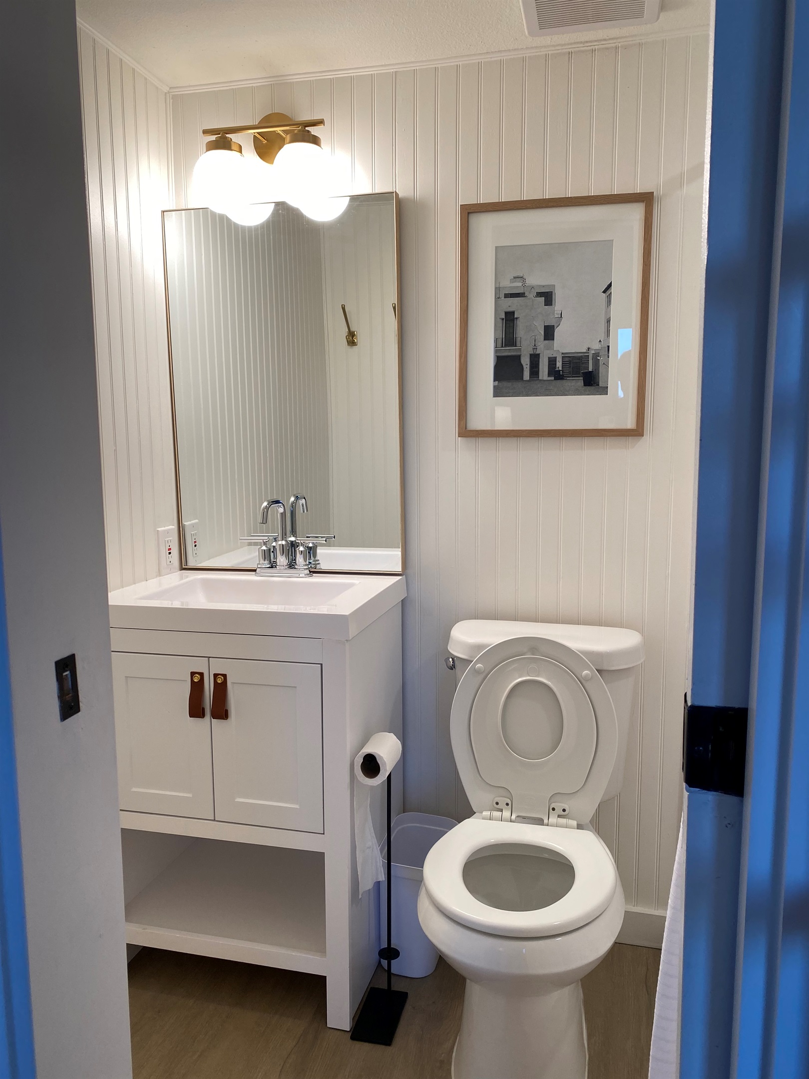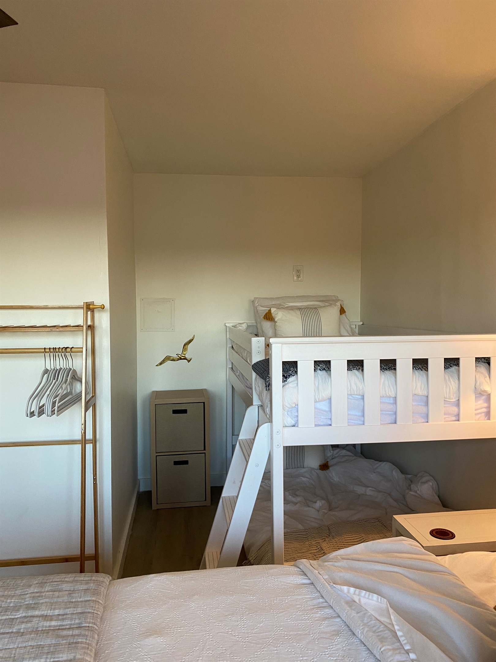First Floor Retreat: Upon entry, you are greeted by an open-concept living and dining area with a fully equipped kitchen featuring updated appliances. The first-floor balcony and guest ensuite—furnished with a queen bed and a set of twin bunks—both offer serene views of the 800-acre Lake Powell.